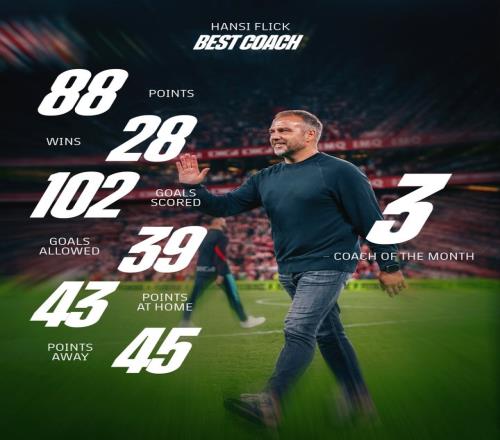 ![]() 体育资讯6月11日报道 巴萨官推今日晒出弗里克数据海报,表示他是最佳教练。 海报上列出,弗里克3次获得月度最佳教练,拿到88分,获得28场胜利,打进102球,只丢39球,主场拿43分,客场拿45分。 |