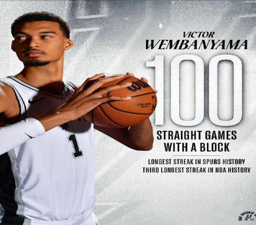 此役后,文班亚马已经连续100场比赛送出盖帽,创造队史纪录,同时也是NBA历史第三长的纪录。